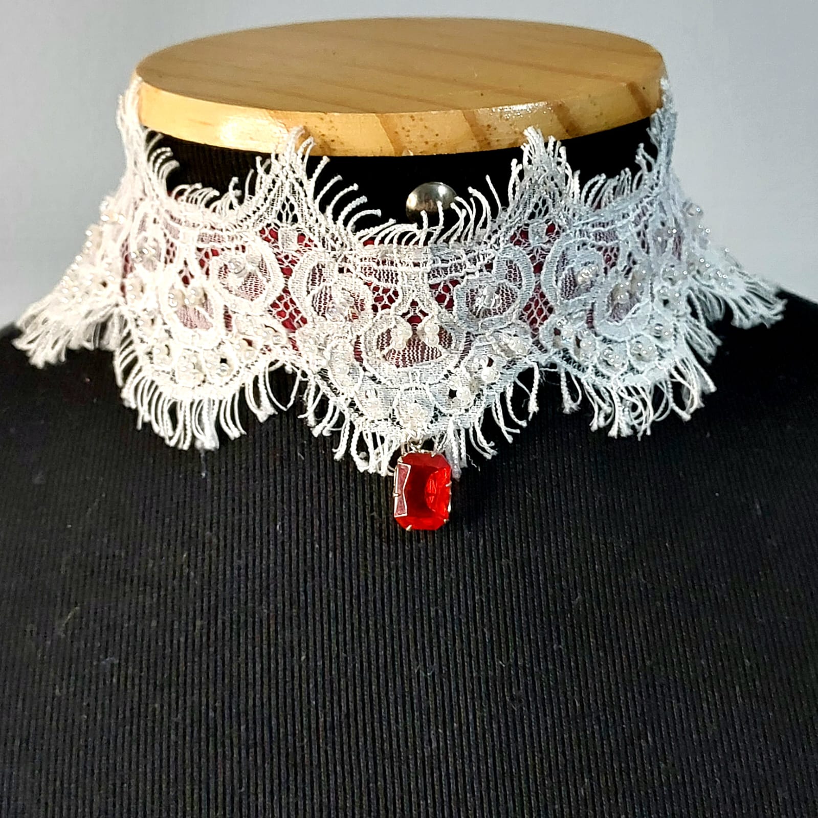 Elegante gargantilha gótica vamp, feita de renda branca com pedrarias e tecido vermelho vintage, na parte de trás fita de veludo preta para dar acabamento. Óbvio não poderia faltar um pingente de pedra vermelha vintage, uma verdadeira gargantilha de uma princesa vampira 🌹🩸